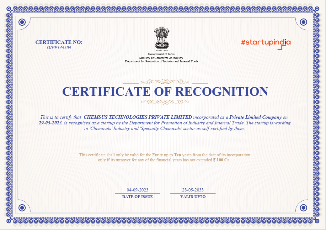 ChemSus Technologies Private Limited is officially recognized as a startup by the Department for Promotion of Industry and Internal Trade (DPIIT), Government of India, under the Startup India initiative.